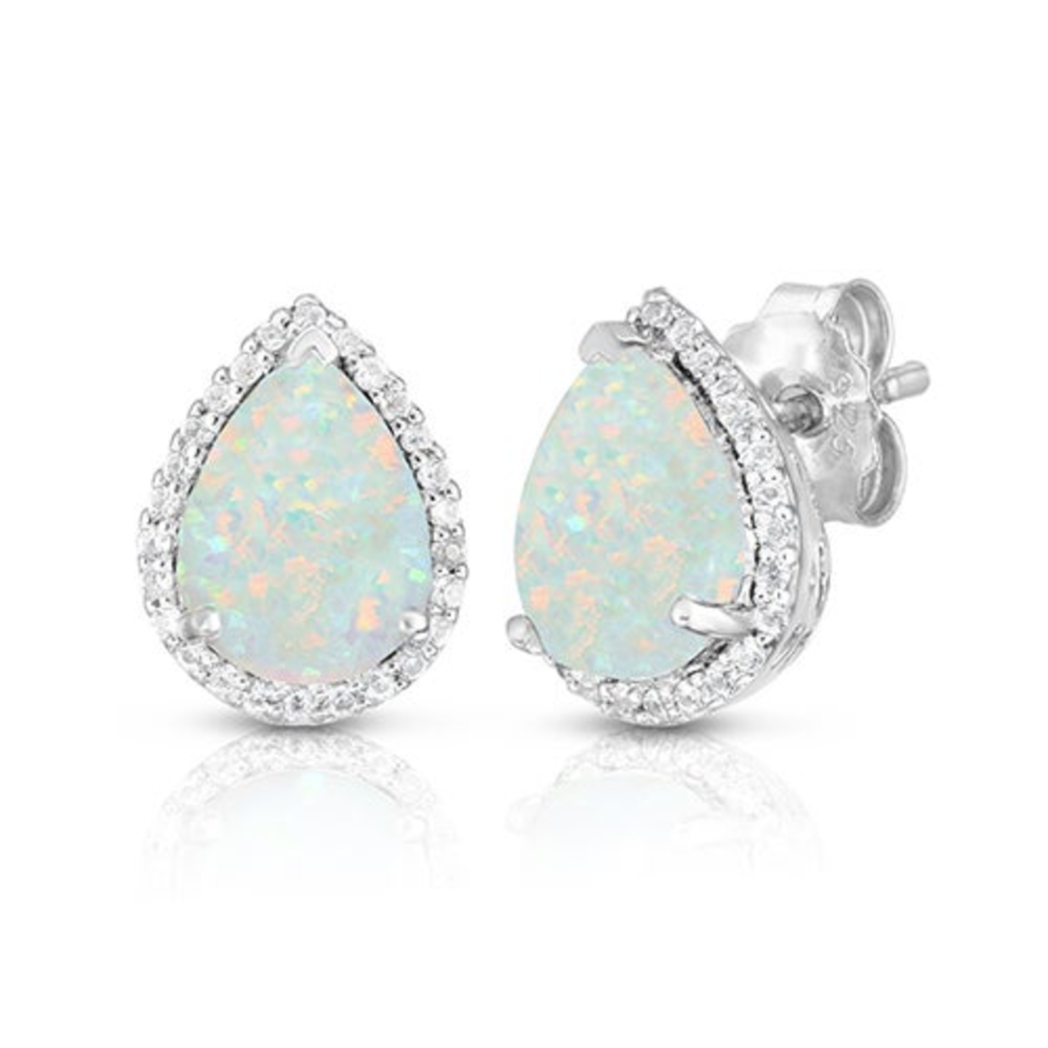 Pear shaped earrings are an iconic style fit for a queen. Wear these at your next soiree to really catch eyes. 8x6mm Pear shaped opals are set in sterling silver. Opals are surrounded by brilliant white sapphires. Post backings - for pierced ears only. Sterling silver has an e-coat to help prevent tarnish.
